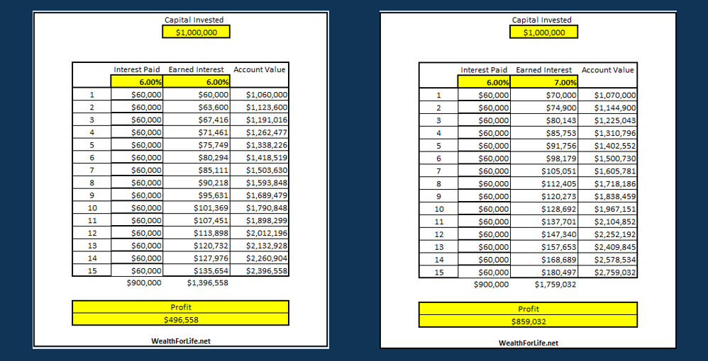 This is based on the concept of “creating arbitrage” or “earning money on the spread”. The basic principles of banking. Oddly enough, if you have time, you don’t even need a spread. This is because loans are based on simple interest while money earns compound interest: